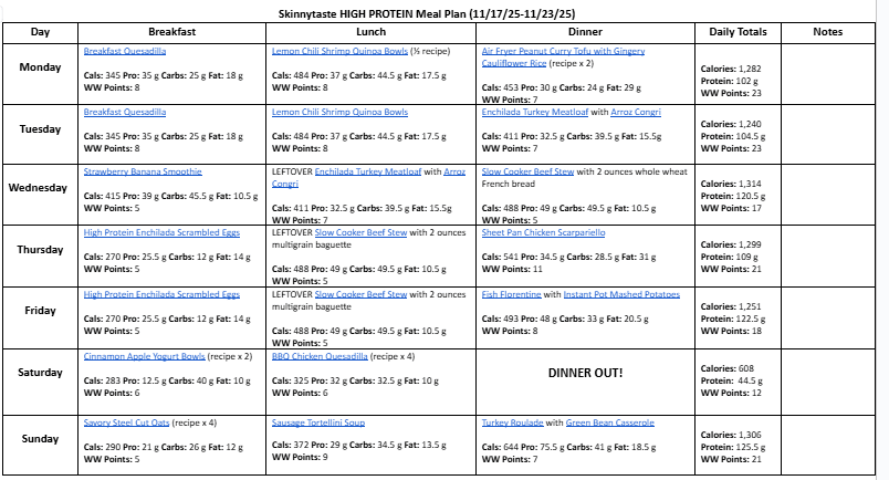 A free, 7-day high protein diet meal plan including breakfast, lunch and dinner ideas and a shopping list. All recipes include macros and Weight Watchers points.