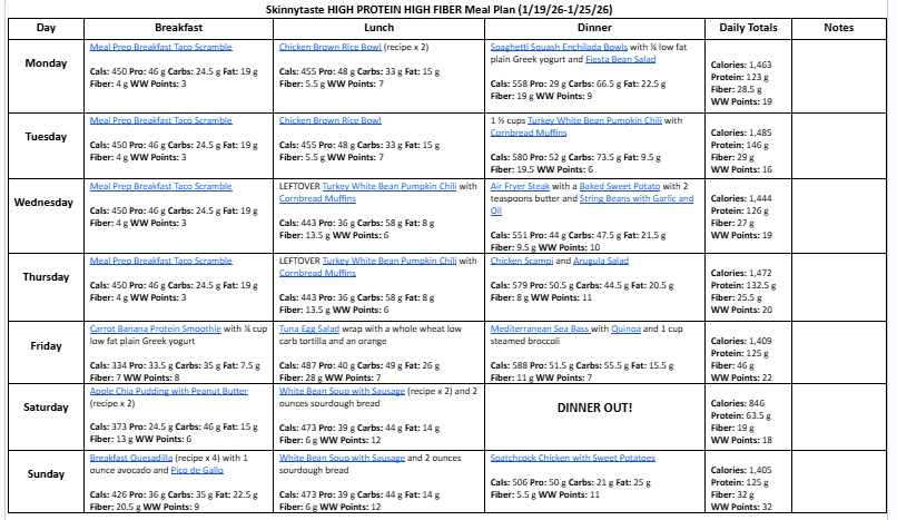 A free, 7-day high protein, high fiber diet meal plan including breakfast, lunch and dinner ideas and a shopping list. All recipes include macros and Weight Watchers points.