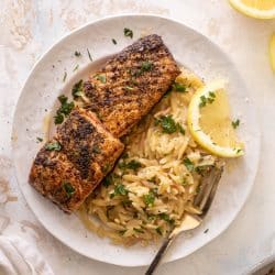 This salmon aglio e olio is so satisfying and delicious, filled with garlicky, herby flavor and served with lemon orzo. It’s a comforting, cozy weeknight meal that is light but filling at the salmon time.