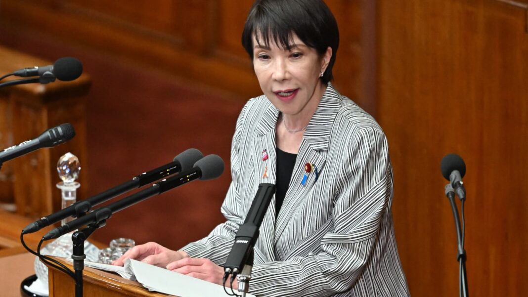 Japan’s Prime Minister Sanae Takaichi answers questions from Yoshihiko Noda, leader of the main opposition Constitutional Democratic Party of Japan (CDP), regarding her policy speech at the House of Representatives of the National Diet in Tokyo on November 4, 2025. (Photo by Kazuhiro NOGI / AFP) (Photo by KAZUHIRO NOGI/AFP via Getty Images)