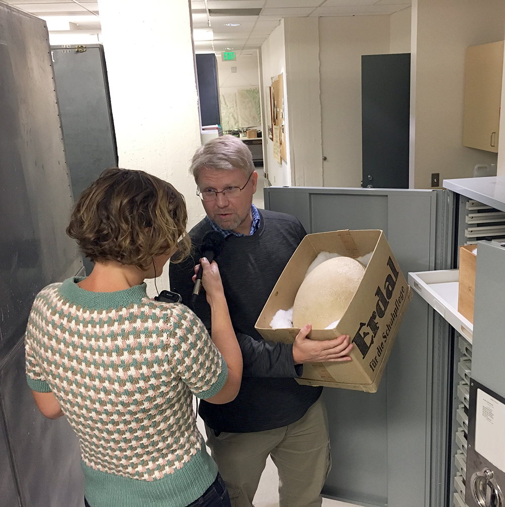 Rauri Bowie holding the box containing one of the MVZ’s two partially fossilized elephant bird eggs—the largest known single cell. Nicky is taping; photo by Geoff Manaugh.