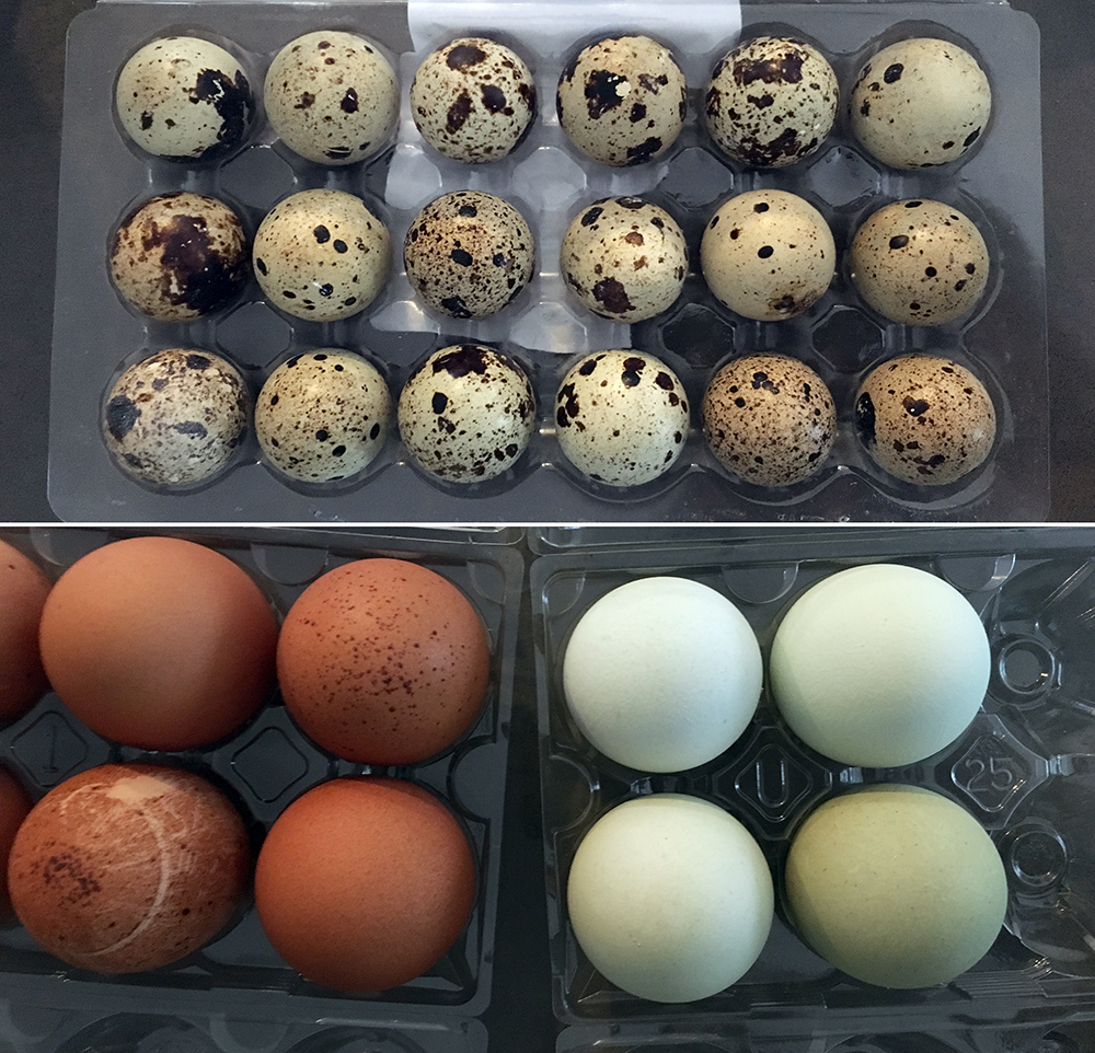 The Great Egg Taste Test: Quail eggs, Andean blue eggs, and dark brown Marans eggs. Photo by Nicola Twilley.